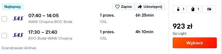 - Przelot do Bodo, a następnie lot do Polski (we własnym zakresie)