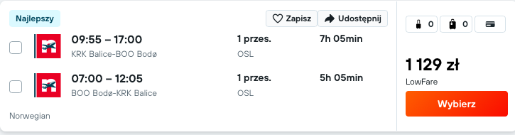 - Przeloty do Bodo odbywają się zarówno z Krakowa jak i z Warszawy, z Bodo lecimy do Svolvaer – kupując bilety należy dopasować godziny przelotów, aby zdążyć z przesiadką.