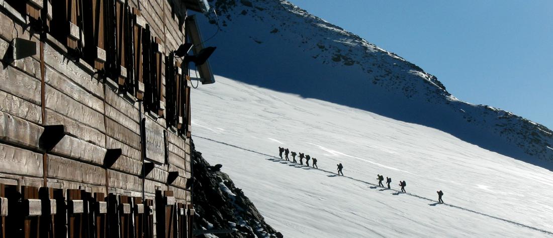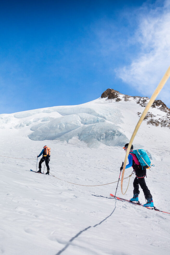 Przed nami dzień wielkiej, lodowcowej włóczęgi. Nasza trasa będzie się wić niczym makaron tagliatelle przez gigantyczne jęzory lodowcowe: najpierw potężny Gornergletscher, a następnie Findelgletscher. Dzień zaczynamy od dobrego śniadania w Zermatt, po czym kolejką wyjeżdzamy na Hohtalli 2700m, skąd ruszamy na fokach. Celem jest Adlerpass (3789 m n.p.m.) – „Przełęcz Orłów”, która będzie bramą do kolejnego smaku naszej podróży. Stąd zjeżdżamy do Britannia Hütte (3030 m n.p.m.). Po włoskiej, radosnej gościnności czas na szwajcarską precyzję, porządek i taras z widokiem, który jest jak doskonale skomponowany deser.