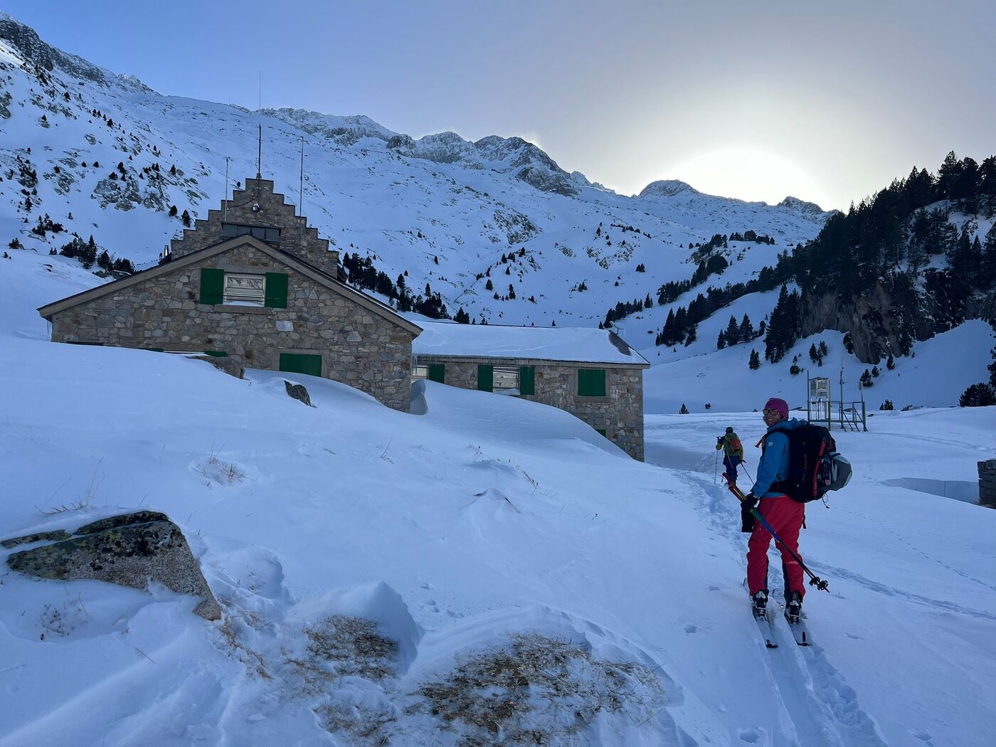 Po śniadaniu i odprawie z przewodnikiem wjedziemy taksówkami do Parku Narodowego Aigüestortes, tak daleko, jak pozwolą na to warunki śniegowe. Tego dnia zanurzysz się w dzikiej przyrodzie jednego z najpiękniejszych parków narodowych Hiszpanii. Aigüestortes to kraina „krętych wód” – otoczą Cię krystalicznie czyste jeziora, granitowe szczyty i gęste lasy sosnowe. Rozpoczniemy naszą wędrówkę do schroniska Estany Llong, gdzie zostawimy główne plecaki. Następnie, już na lekko, wyruszymy na turę do pobliskiej doliny Corticelles, słynącej ze świetnych warunków śniegowych. Po drodze odbędziemy krótkie, praktyczne szkolenie lawinowe. Noc spędzimy w klimatycznym, górskim schronisku Estany Llong, z dala od cywilizacji (kolacja w cenie).
